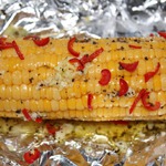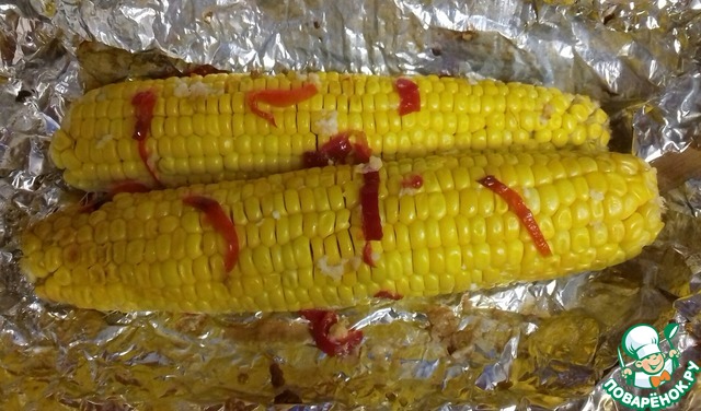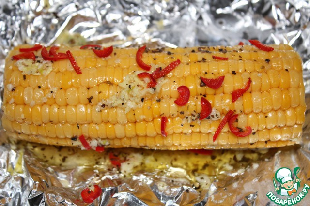 Смазать початки с помощью кисточки маслом со специями, посыпать орегано, перцем чили. Завернуть в фольгу. Запекать на решетке при 190* 20-40 минут, в зависимости от сорта кукурузы.