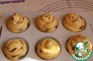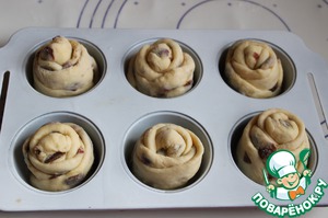 Ставим наши розочки в форму, смазанную хорошо маслом. Можно взять и формочки для кексов, тогда будет лучше доставать булочки. Убираем теперь их в духовку на 10 минут на расстойку на 50 градусов.