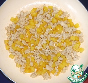 Куриное филе пропустить через мясорубку или очень мелко нарезать, слегка обжарить на растительном масле.