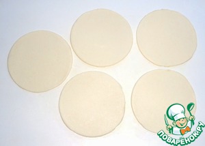 Готовое слоёное бездрожжевое тесто разморозить по надобности, раскатать и с помощью круглой формы выдавить кружки, диаметр которых должен быть ~10 см.