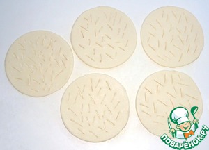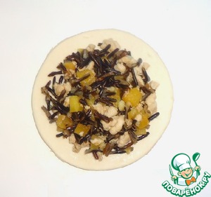 Затем на кружок, который без надрезов, выложить начинку, начинки должно быть много. Начинку можно предварительно разделить на 5 равных частей или сразу поровну выложить на 5 кружков из теста.