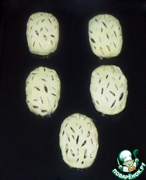 Выложить на противень и смазать яичным желтком. Выпекать в разогретой духовке до 180-200 градусов 25-30 минут до появления румяного цвета.