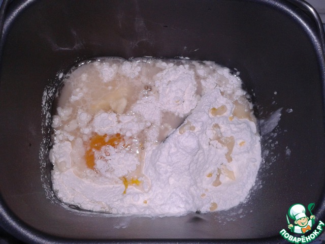• Приготовим тесто. Я замешиваю тесто с помощью хлебопечки, можно и вручную. В ведерко хлебопечки влить теплую воду (220 мл.), добавить дрожжи и оставить на 5-10 мин. до образования шапочки. После добавляем просеянную муку, 3 ст. л. сахара, соль, размягченное сливочное масло, растительное масло, 2 яйца и замешиваем тесто.
