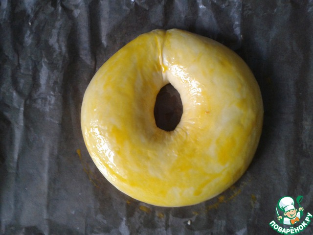 • Смазать кольцо желком и посыпать лепестками миндаля (я посыпала измельченными грецкими орехами).