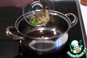 Острый перец, орегано, тмин, горчицу и измельченный имбирь высыпаем в кастрюлю