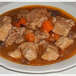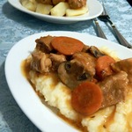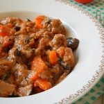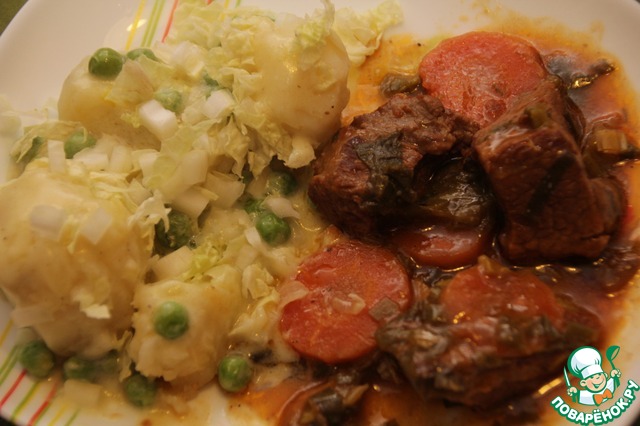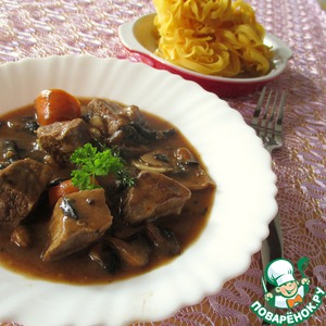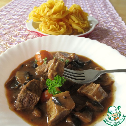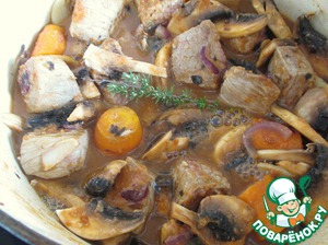 Добавить 5 ст. л. муки, хорошо перемешать, посолить и поперчить. Добавить обжаренные овощи, нарезанные грибы (250 гр), тимьян (3 веточки), 1 ст. л. томатной пасты, 200 мл воды и 200 мл вина. Посолить и поперчить заново, перемешать. Уменьшить огонь практически до минимума и тушить под закрытой крышкой 2-2,5 часа.