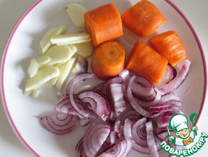 Нарезать лук-шалот или другой маленький лук (3 шт), морковь (4 шт) и 1 зуб. чеснока. В сотейнике разогреть немного раст. масла на среднем огне и обжарить овощи в течениe 5 мин. Затем их извлечь.