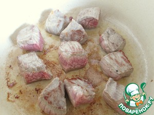 При необходимости, добавить еще немного масла. Увеличить огонь и обжарить мясо (1,5 кг), нарезанное крупными кубиками, до золотистой корочки.