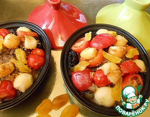 Замоченный нут промыть, воду слить. Уложить в каждый тажинчик поверх по куску мяса, добавить обжарку, полить пряным маслом (при этом барбариски и другие прижарки отфильтруются).