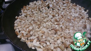 Итак, грибы режем кубиком. На сковороде топим сливочное+оливковое масла и обжариваем грибы.