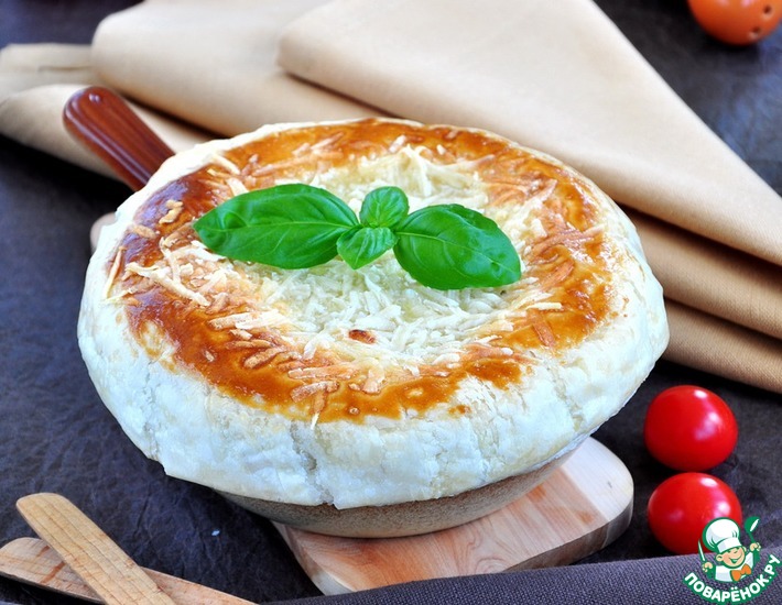 Из слоеного теста вырезать круг размером больше диаметра сковороды. Накрыть сковороду, хорошо прижать тесто. Натереть пармезан. |