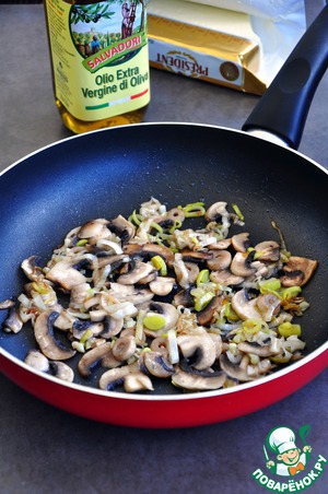 Обжарить грибы и лук-порей в оливковом масле с добавлением сливочного, соотношение - 1:1.