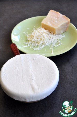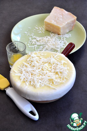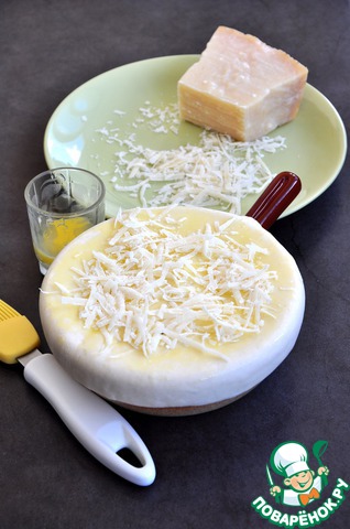 Сделать несколько надрезов на тесте. Взбить желток, смазать им тесто, посыпать натертым пармезаном. Запекать в духовке при 180* 35-40 минут. |