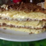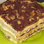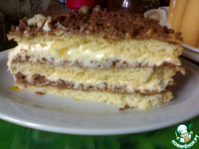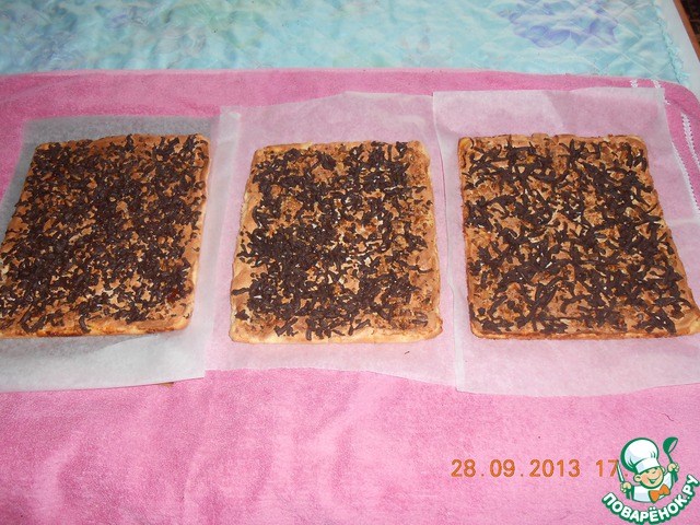 Промазать каждый пласт кремом, кроме верхнего, сложить друг на друга и дать пропитаться 3 часа.