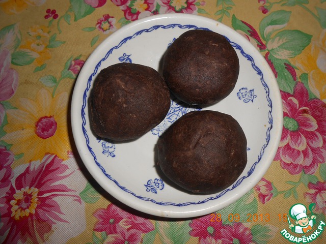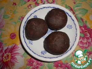 маргарин 100 гр натереть на терке, добавить 100 гр муки и 1,5 ст. л. какао - замесить тесто, разделить на 3 части, сделать мячики и положить в морозилку на 20 минут -