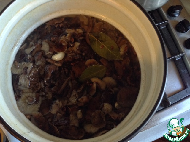 Затем в кипящий маринад выкладываем наши вареные грибочки. Когда закипит, дать им покипеть 5 мин...