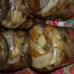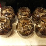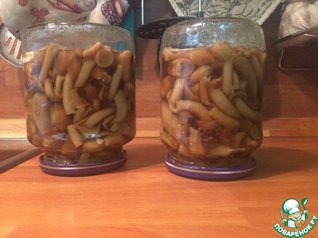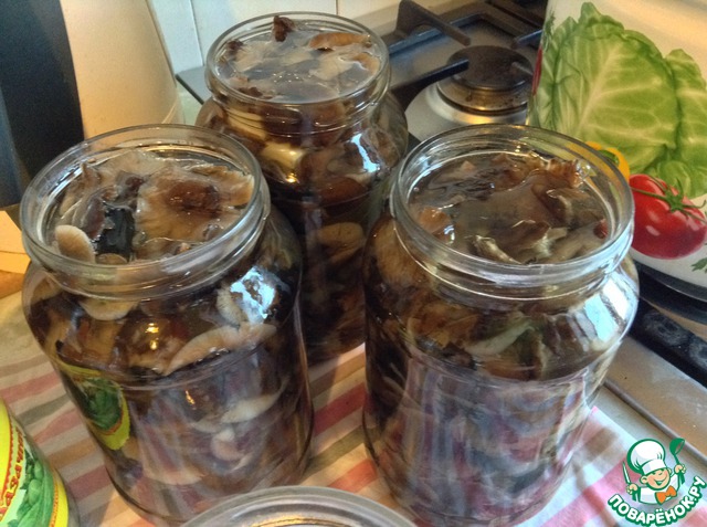 ... спустя пять минут после закипания выключаем плиту и раскладываем грибы с маринадом по банкам. Банки наполняем до краев и сверху льем немного подсолнечного масла.