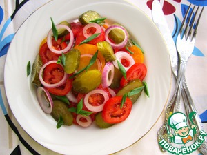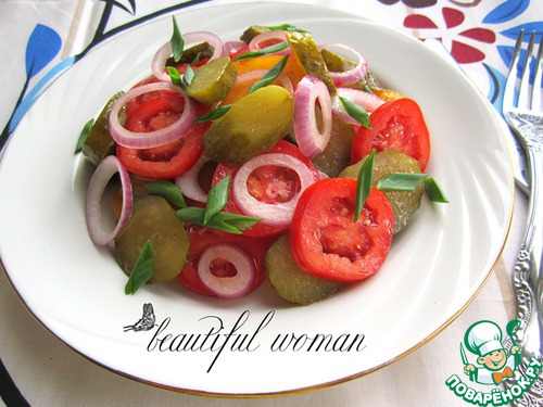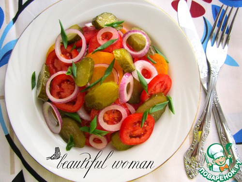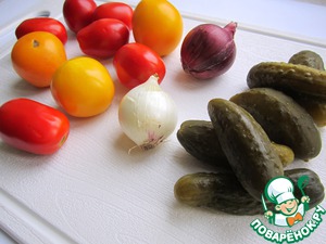 Продукты, которые нам необходимы для приготовления салата, есть в каждом доме практически круглый год - свежие помидоры, соленые огурцы и салатный лук.