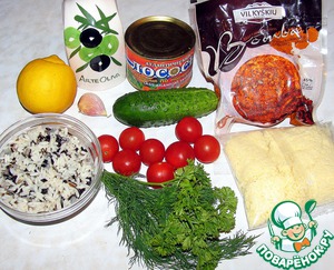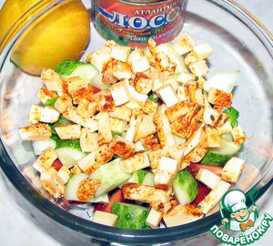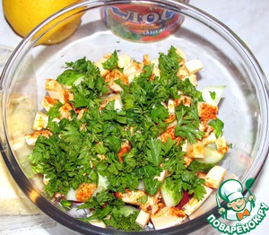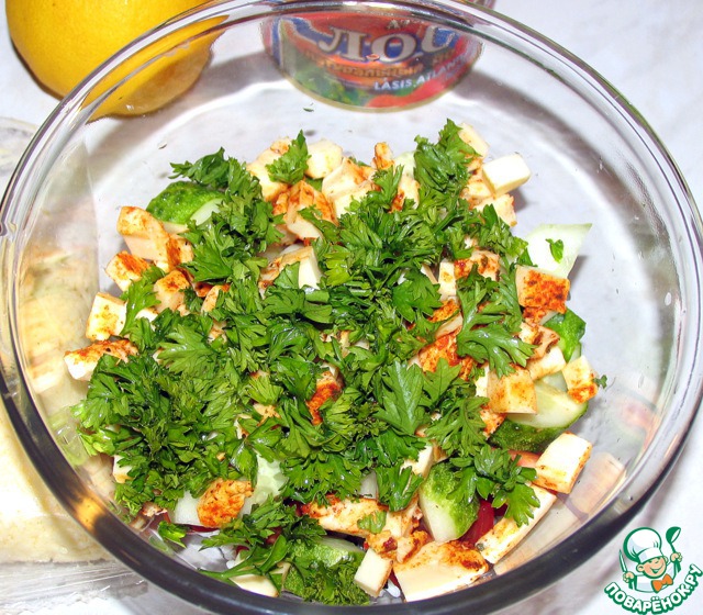 Описание из рекламки. (Уложите ингредиенты слоями на сервировочное блюдо. Приготовьте соус, перемешав сок лимона, толчёный чеснок, цедру лимона, перец и накрошенный укроп. Взбивая соус венчиком, добавьте струйкой оливковое масло. Вылейте готовый соус на салат и подавайте. Салатом можно наполнить корзиночки из посочного теста.)