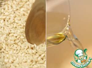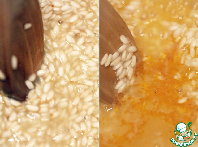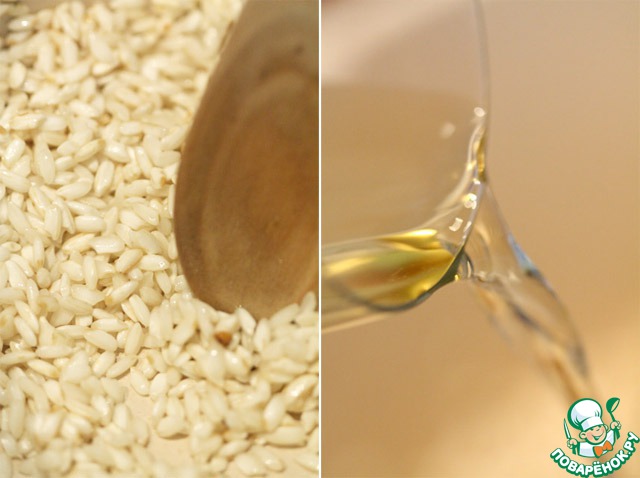 И так, начнем готовить ризотто. Возьмем две кастрюле, в одной доведем до слабого кипения наш бульон. Во второй кастрюле разогреем 1 ст. л. оливкового масла, в течение 1 минуты обжарим в нем рис, за тем вольем вино.