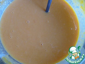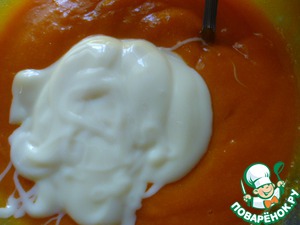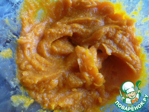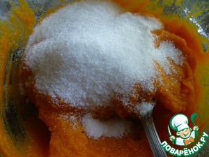 Добавить к горячему тыквенному пюре сахар и соль, перемешать. Дать слегка остыть.