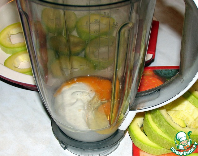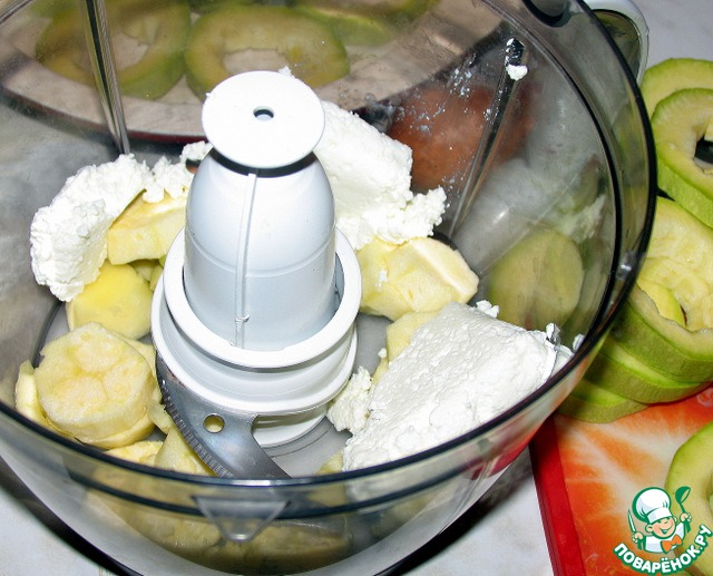 Серединки кабачков (мякоть) измельчить вместе с творогом и чесноком.