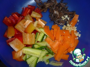 Мы с мужем попробовали этот салат в китайском ресторане. Решила повторить дома что-то "по мотивам". Ингредиенты отличаются, отсюда и название. Ну, нет у нас в городе китайских древесных грибов, даже шиитаке не найти. Мой 1-й рецепт на Поваренке, не судите строго!