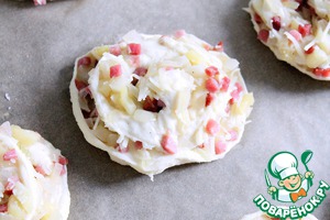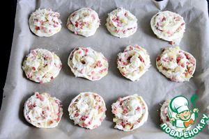 Поочередно выкладываем рулетики на застеленный пекарской бумагой противень разрезом вниз и немного "приплющиваем". При этом получаются такие вот улитки (или розочки?).