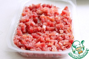 Бекон порезать на мелкие кубики. Лучше всего брать именно бекон (я брала что-то вроде бекона, но без сала), но если уж сильно хочется, то можно взять, например, подкопчённое мясо или колбасу. Тут важна именно копченая нотка.