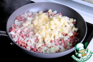На небольшом количестве растительного масла обжарить лук с беконом, затем добавить яблоки. Обжаривать нужно до момента, когда яблоки станут мягче, на это уйдет около 5 минут. Если вы берете именно бекон, то масло можно вообще не добавлять, т. к. с бекона вытопится достаточно жира. Каким бы странным сочетание не казалось, получается очень вкусно ;)