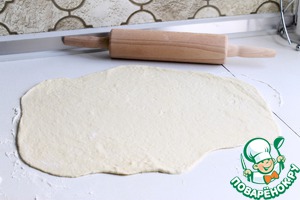 Так воооот... Раскатываем тесто. У меня, конечно, не прямоугольник получился, но размеры, примерно как и указано, т. е. 27*36 см. Не жалейте муки, хорошо посыпайте стол, иначе будет трудно отдирать тесто от стола, и в худшем случае оно порвется. -