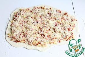 Сверху посыпаем тертым сыром и закатываем все это дело в рулет. Рулет разрезаем на 12 примерно равных частей.