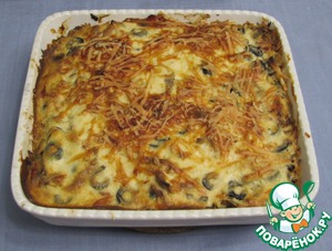 Курицу, разобранную на волокна, обжарить в масле и половину выложить в форму. Сверху присыпать нарезанными маслинами. Повторить процедуру в том же порядке.