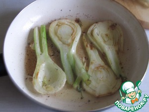 Фенхель порезать на тонкие пластинки и обжарить с двух сторон в масле.