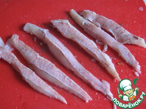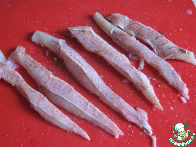 Рыбу почистить, разделать на филе и нарезать полосками. Рыбу посолить, поперчить, смазать маслом.