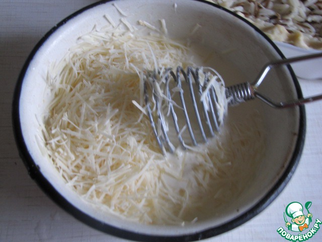 Смешать сливки, яйца, добавить тертый пармезан.