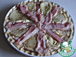 Выложить сверху, слегка вдавливая в начинку, фенхель и рыбу.