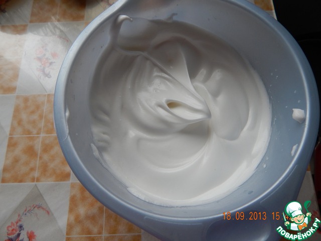 Для начала необходимо хорошо взбить белки, потом добавить сахар и продолжить взбивать до "твердых" пиков