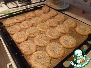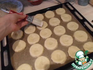 С помощью стаканчика вырежьте кружки и уложите их на противень с пекарской бумагой. Диаметр кружков - произвольный, в духовке они практически не подрастают - лишь слегка. -