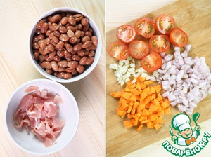 И так, приготовим наши основные продукты. Средними кусочками нарежем морковь и лук, сельдерей зачистим и так же нарежем (я его не очень люблю, так что нарезала помельче), разрежем пополам черри. Сольем воду из фасоли и мелко нарежем бекон (предварительно срезав жир).