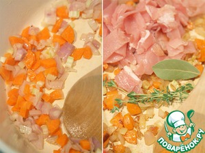 В кастрюлю нальем оливковое масло, разогреем, добавим порезанные лук, морковь и сельдерей, немного посолим и поперчим и будем обжаривать овощи на среднем огне минут 6-8, постоянно помешивая. Потом добавим тимьян, лавровый лист, бекон, добавим огонь и будем готовить еще 2-3 минуты.