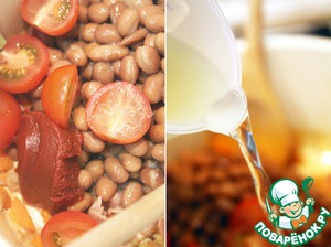 Добавим томатную пасту, фасоль и помидоры, вольем бульон (рецепт можно посмотреть тут - http://www.povarenok .ru/recipes/show/789 25/, а при желании использовать воду), доведем до кипения...