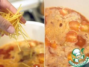 ... закинем поломанные спагетти и будем варить до готовности, около 10 минут (смотри инструкцию на упаковке). После этого выключим огонь, попробуем и добавим по вкусу еще соли и перца.