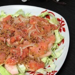 Так что, я бы посоветовала нарезку делать более мелкими кусочками и основную часть салата перед подачей заправить и перемешать и лишь сверху украсить несколькими большими ломтиками.
