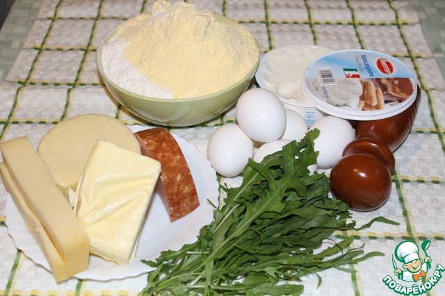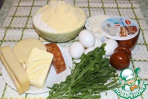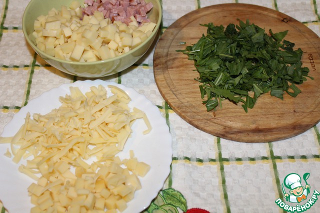 Пока тесто охлаждается, приготовим начинку. Моцареллу и ветчину нарезаем кубиками, рукколу - крупно, половину твердого сыра - кубиками, другую - натереть на крупной терке.