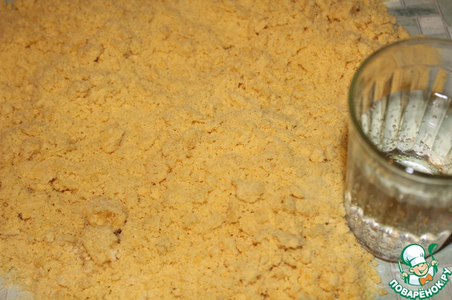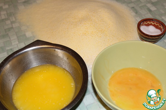 Готовим тесто: муку просеем, на водяной бане растопим сливочное масло и остудим (одну столовую ложку отложим для смазывания формы), яйцо и желтки слегка взобьем вилкой.