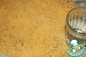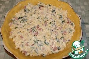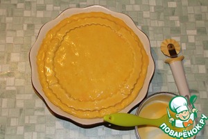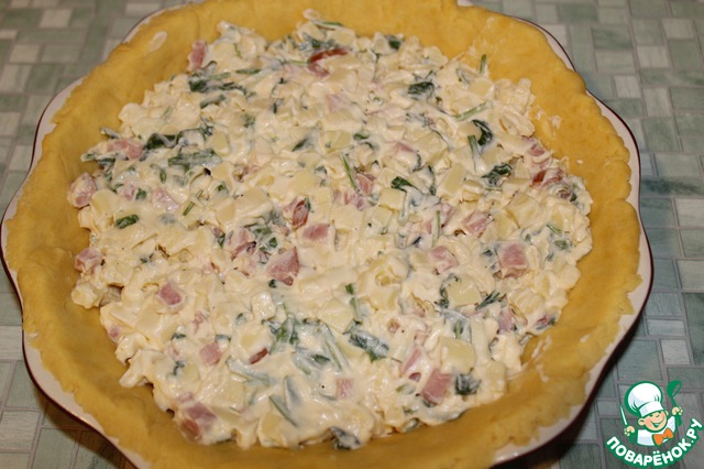 Большую часть теста, выкладываем в смазанную маслом форму, формируем бортик, выкладываем начинку и разравниваем.