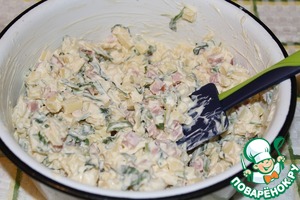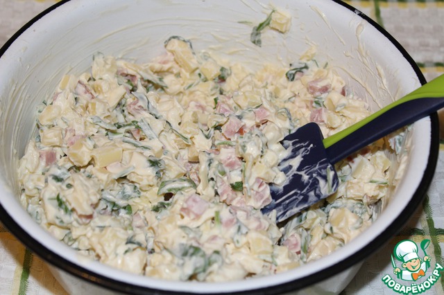 Подготовленные составляющие перемешаем с творожным сыром, яйцом, одним желтком, солью и перцем.