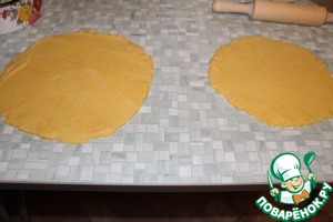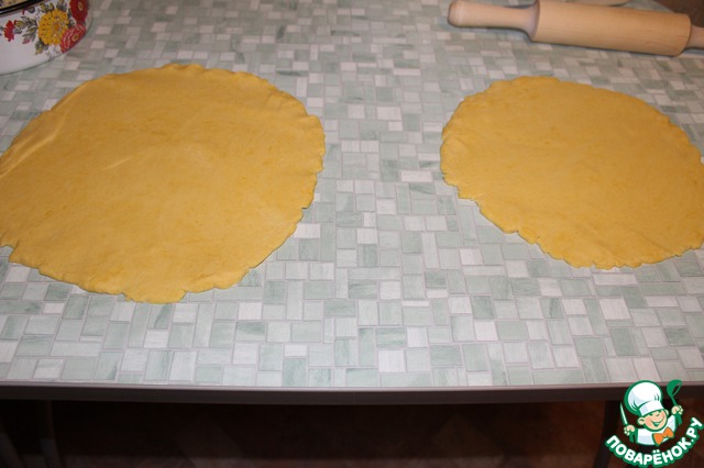 Тесто достаем из холодильника, делим на две неравные части и раскатываем.