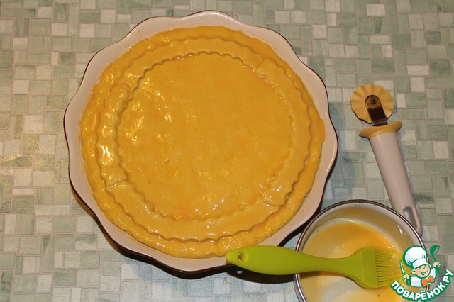 Накрываем оставшимся тестом, из оставшихся кусочков теста можно вырезать полоски с фигурным краем и наложить на края пирога, но это не обязательно. Смазать пирог желтком.